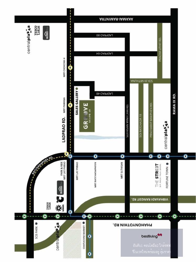 Groove Scape 48 A luxurious new condo in a prime location near MRT Lat Phrao and MRT Phawana, offering 32.47 sq.m. units on every floor! There are also other sizes available as this is a brand new condo.